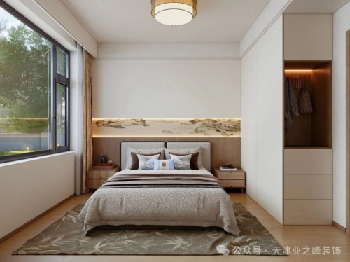 在细节处理上,业之峰同样展现出了其专业与匠心。主卧室的木饰面半墙设计与嵌入式灯带,既保证了光线的柔和与层次感,又营造出一种温馨舒适的睡眠氛围。