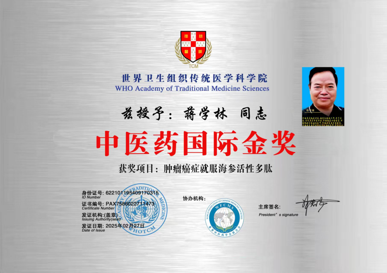 以我88岁的叔叔为例(患前列腺癌晚期全身扩散),2021年10月11日入院在四川省肿瘤医院住院20多天,因身体太虚弱(1.8米的个子,体重只有90多斤),卧床不起,癌细胞扩散全身疼痛抗不住放疗、化疗对身体的伤害,医生建议保守治疗,在医院治疗20多天越治病情越严重,已经躺在床上不能正常进食了,医生说医院已经尽力了,让出院后想吃啥就吃点啥,2021年11月5日《出院证明书》上写明:总前腺特异抗原21.00(ng/ml),前列腺右叶腺癌肿瘤占比约80%,出院后在服医院开的抗肿瘤药物的同时,每天早、中、晚各服15克海参活性多肽,服肽一个月后全身不痛了,服肽两个月后就能下床正常吃饭了,服肽3个月后就能出门散步了,2024年1月17日去四川省肿瘤医院检验,《检验报告单》写明:前列腺特异抗原<0.01(ng/ml),正常人为(0-4ng/ml),身体恢复得比患癌症以前还要好,现在已经能出外游玩了!